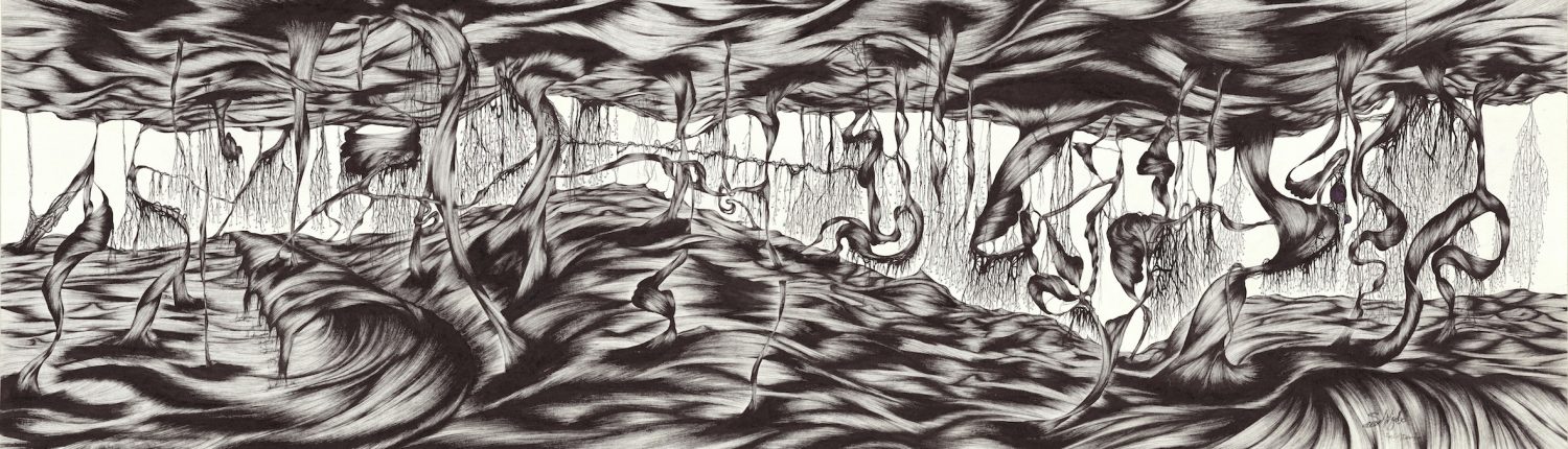 Cet artiste autodidacte s’efforce de transmettre par le dessin son attachement à la nature, et aux arbres en particulier, qui forment le motif central de son œuvre en évolution. C’est ainsi à l’image de leur créateur, pétri de cultures entremêlées, que les arbres dessinés déploient leurs racines avec force, et dressent fièrement un entrelacs fécond de branches, que l’on pourra emprunter du regard comme autant de chemins et d’histoires possibles. Car les formes qu’il tisse avec la plume, le pinceau ou le crayon, laissent une totale liberté d’appropriation au regardeur, qui pourra se promener dans l’histoire, à la fois universelle et particulière, que raconte chaque arbre.