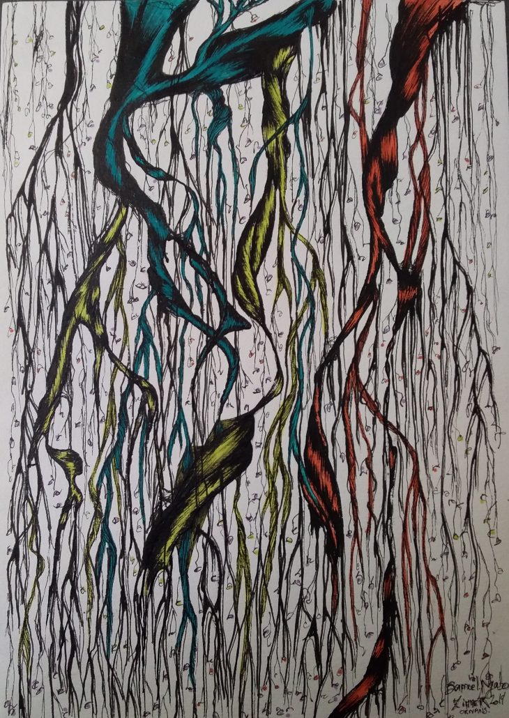 Cet artiste autodidacte s’efforce de transmettre par le dessin son attachement à la nature, et aux arbres en particulier, qui forment le motif central de son œuvre en évolution. C’est ainsi à l’image de leur créateur, pétri de cultures entremêlées, que les arbres dessinés déploient leurs racines avec force, et dressent fièrement un entrelacs fécond de branches, que l’on pourra emprunter du regard comme autant de chemins et d’histoires possibles. Car les formes qu’il tisse avec la plume, le pinceau ou le crayon, laissent une totale liberté d’appropriation au regardeur, qui pourra se promener dans l’histoire, à la fois universelle et particulière, que raconte chaque arbre.