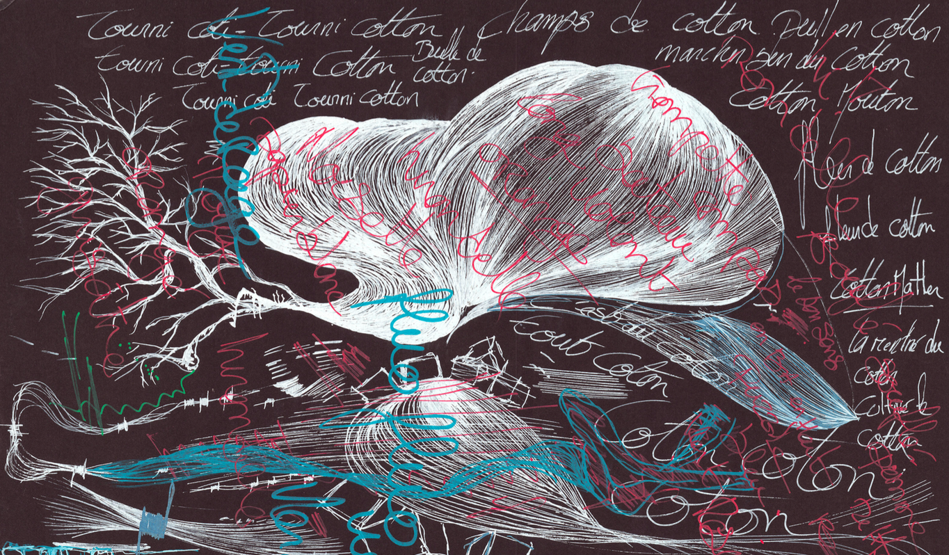 Qu’elles apparaissent de manière très figurative ou de manière moins évidente sous formes de fibres végétales, ces propositions dessinées explorent avec intelligence un parangon de « l’ancrage ». Ainsi, en partant de la fleur de coton, l’artiste élabore une multitude de motifs parallèles : lianes, fils, arbres, vagues, etc. C’est d’autant plus juste dans les œuvres plus géométriques.